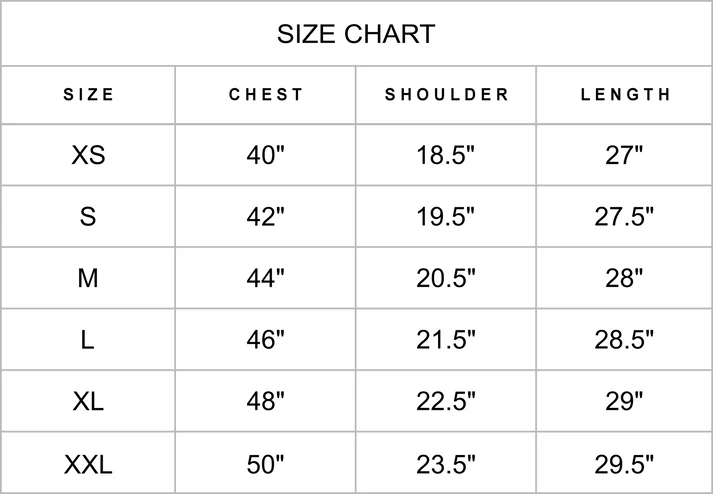 Sizing: Garment measurement in inches.